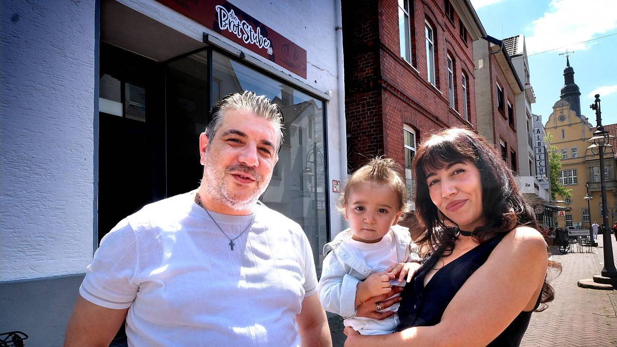 Wollen in Gütersoh italienische Delikatessen anbieten: Koch Simone Santoro und Inhaberin Sarah D’Amico, hier mit Sohn Santiago, eröffnen im August an der Moltkestraße das "Dolce Vita". | © Andreas Frücht