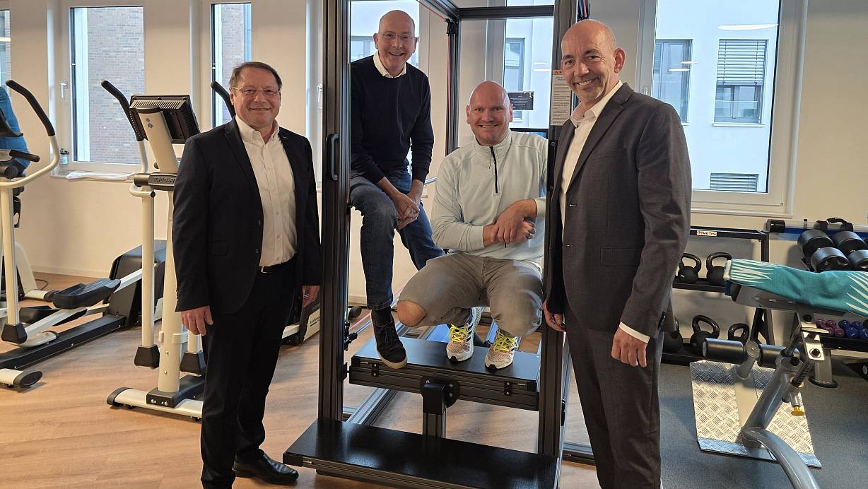 Peter Kinnett (Vorstand BKK Miele), Siegfried Rösel (Oberarzt am Klinikum Gütersloh), Sebastian Mäueler (Geschäftsführer Mobilo) und Stefan Döding (Geschäftsbereichsleiter BKK Bertelsmann) sind maßgeblich am Netzwerkaufbau der Onkologischen Trainingstherapie in Gütersloh beteiligt. | © Celina Allard