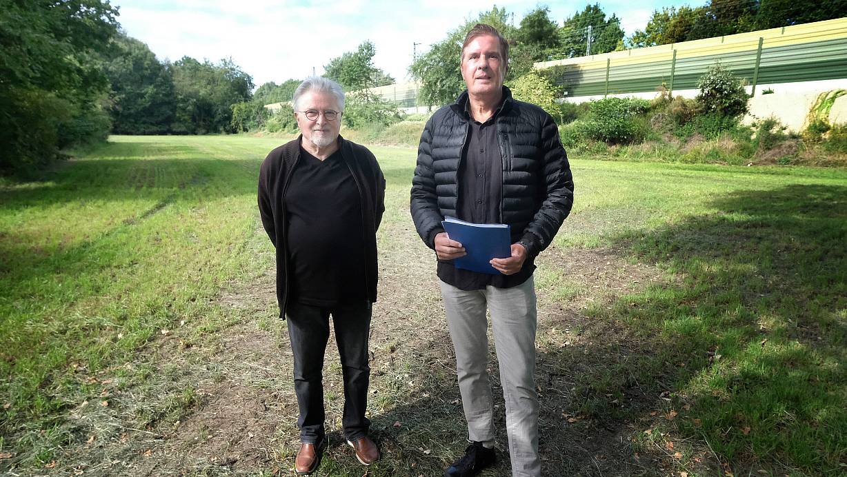 Architekt Reinhard Drobeck (72, l.) und Immobilienkaufmann Klaus Groß (60) sind im Sinne von Aldi unterwegs. Sie stehen auf der Wiese, auf die der Discounter eine neue Filiale betreiben möchte. | © Andreas Frücht