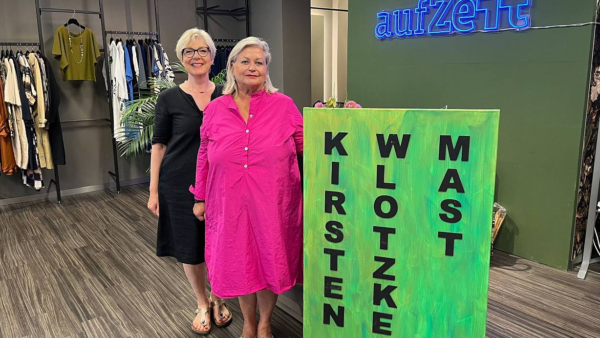 Kirsten Wlotzke Mast (rechts) verkauft für drei Wochen ausgewählte Designer-Mode ihrer gleichnamigen Boutique im Pop-up-Store an der Kökerstraße und wird dabei tatkräftig von ihrer Kollegin Simone Johannwille unterstützt. | © Jule Prietzel
