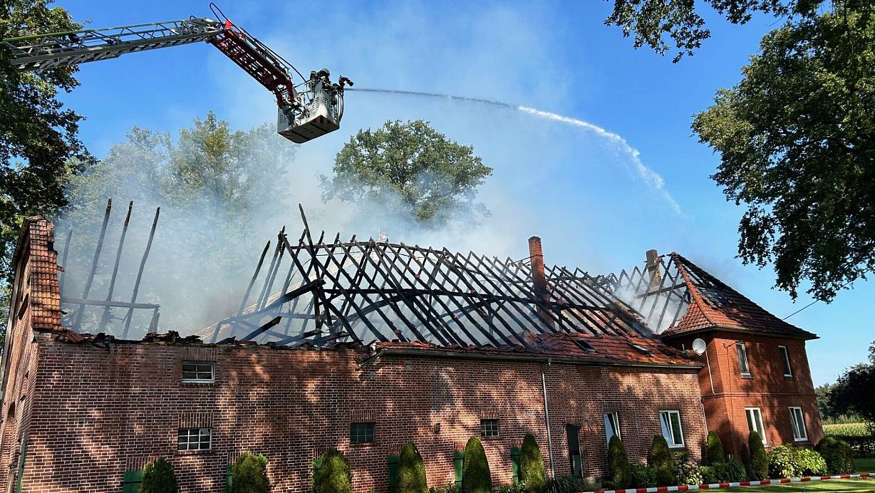 27. August 2024 - bei einem zerstörerischen Dachstuhlbrand auf dem Hof Schmäling in Gütersloh werden Wohnhaus und Deele zerstört. Rund 100 Feuerwehrleute sind beim Großeinsatz mit den Löscharbeiten beschäftigt. | © Christian Bröder