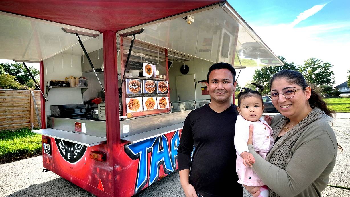 Haben sich mit einem Imbissanhänger selbstständig gemacht: Nares (links) und Ninorta Önder mit Tochter Thalia, nach der ihr Foodtrailer benannt ist. | © Andreas Frücht