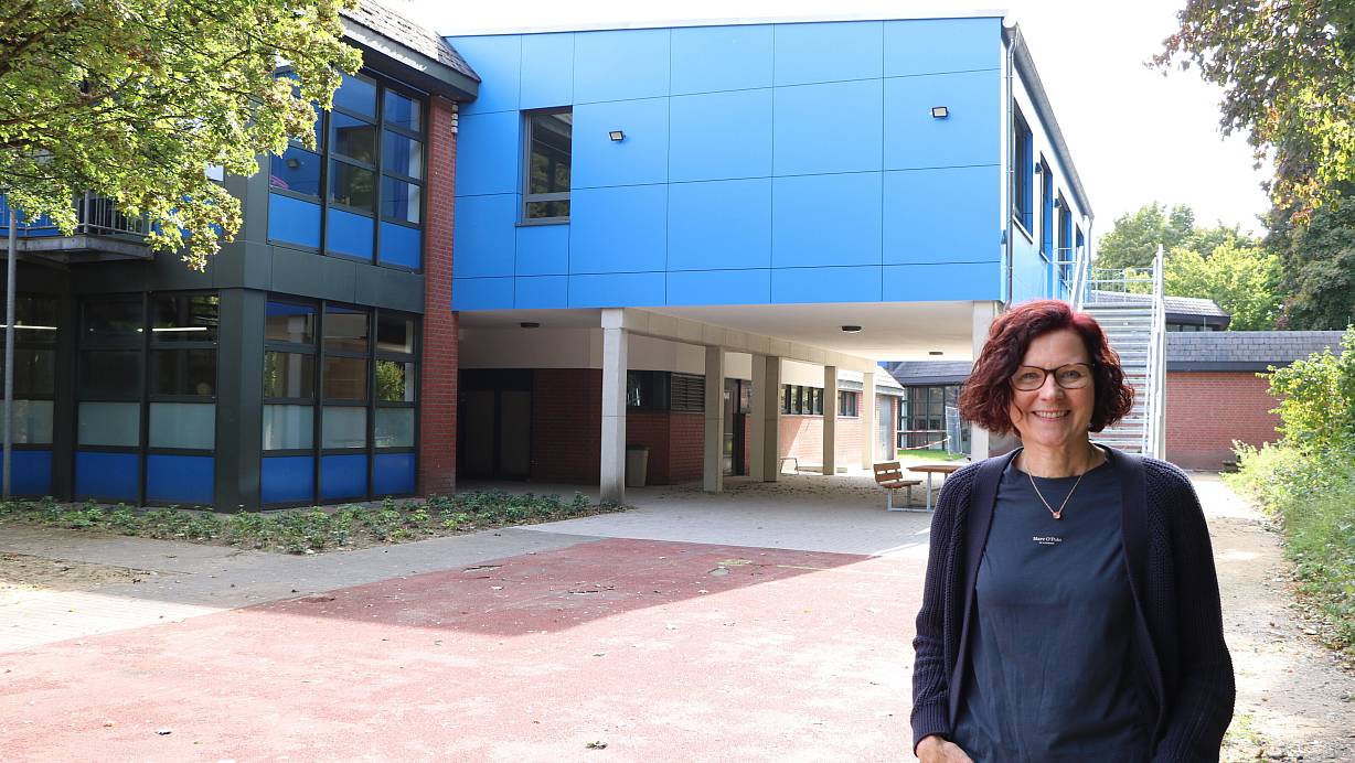 Schulleiterin Karin Delker-Lienke freut sich über die zwei neuen Klassenräume in dem blauen Anbau der Gütersloher Schule. | © Anja Hustert