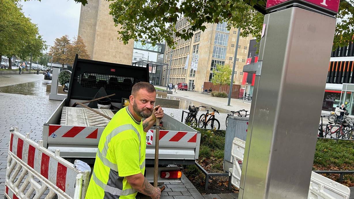Simon Dean und seine Kollegen kümmern sich am Gütersloher Rathaus und zehn anderen Standorten um die Entfernung der letzten Telekom-Telefonsäulen. | © Christian Bröder