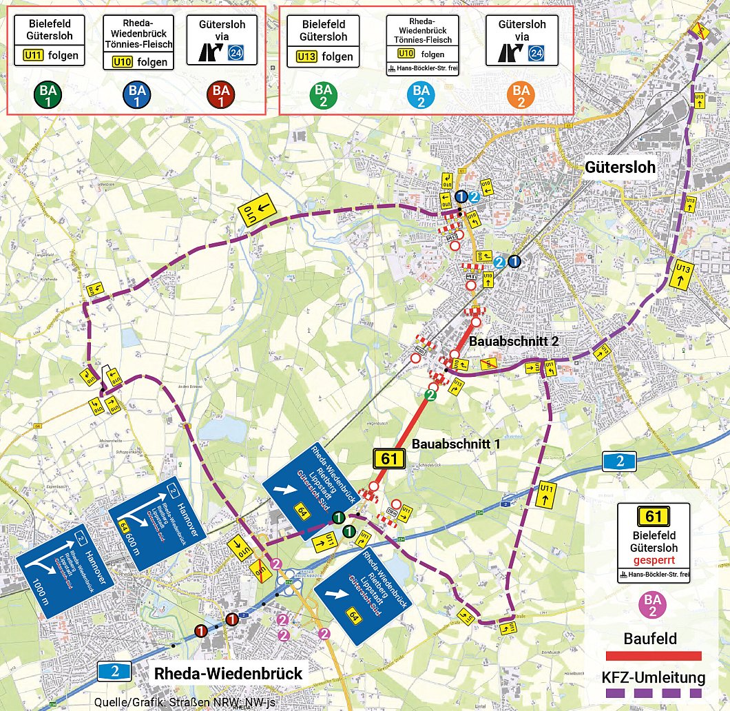 Die Umleitung in Richtung Rheda-Wiedenbrück ändert sich nicht. Die Umleitung in Richtung Gütersloh Innenstadt/Bielefeld erfolgt zunächst weiterhin über Kornstraße/Varenseller Straße/ Brockstraße bis zum Stadtring Sundern. Von dort führt die Umleitung weiter über den Stadtring Sundern und den Stadtring Nordhorn bis zur B 61/Berliner Straße (Umleitungsende).