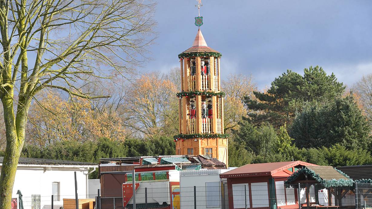 Schon jetzt ein Blickfang: Die Weihnachtspyramide nahe der B61 in Höhe Isselhorst ist kaum zu übersehen. Ab Freitag beginnt ihr Aufbau auf dem Berliner Platz in Gütersloh | © sport/presse/foto Dünhölter