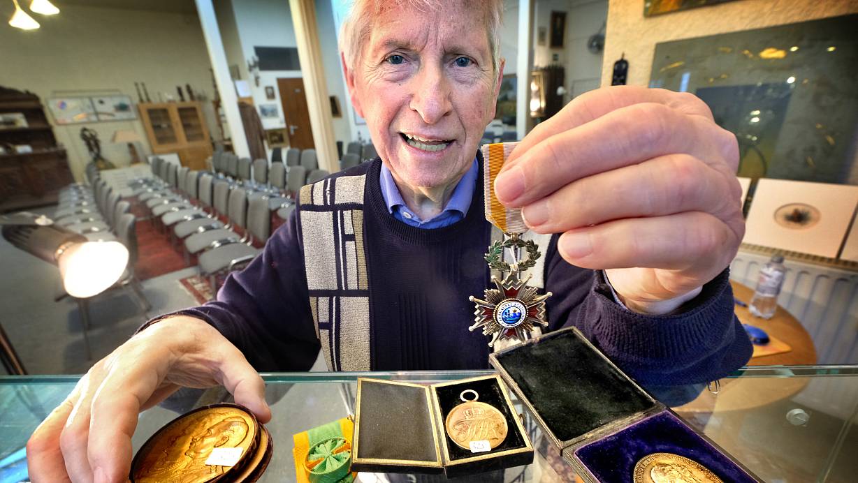In einer Hand hält der Gütersloher Detlef Jentsch den Orden Isabellas der Katholischen, in der linken eine bronzene Gedenkmedaille zur Weihe des Berliner Doms, die Kaiser Wilhelm II. und Gemahlin Auguste Victoria zeigen. | © Andreas Frücht