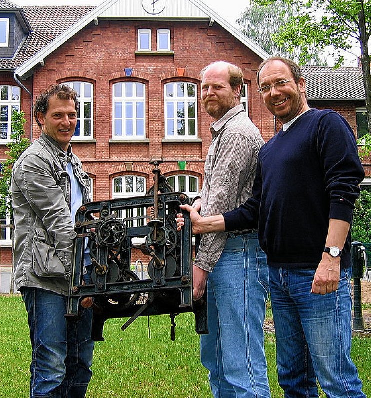 Geschätzte 30 Pfund wiegt die in einem hölzernen Schrank unter dem Dach aufbewahrte Uhr, die Haselhorst und Brinkschneider gestern demontierten und zum Abtransport auf den Schulhof trugen. Haselhorst, spezialisiert auf antike Uhren, wird sie jetzt erst einmal "komplett zerlegen". Die einzelnen Teile wird der Bielefelder vom Rost befreien und prüfen, ob sie einwandfrei funktionieren.