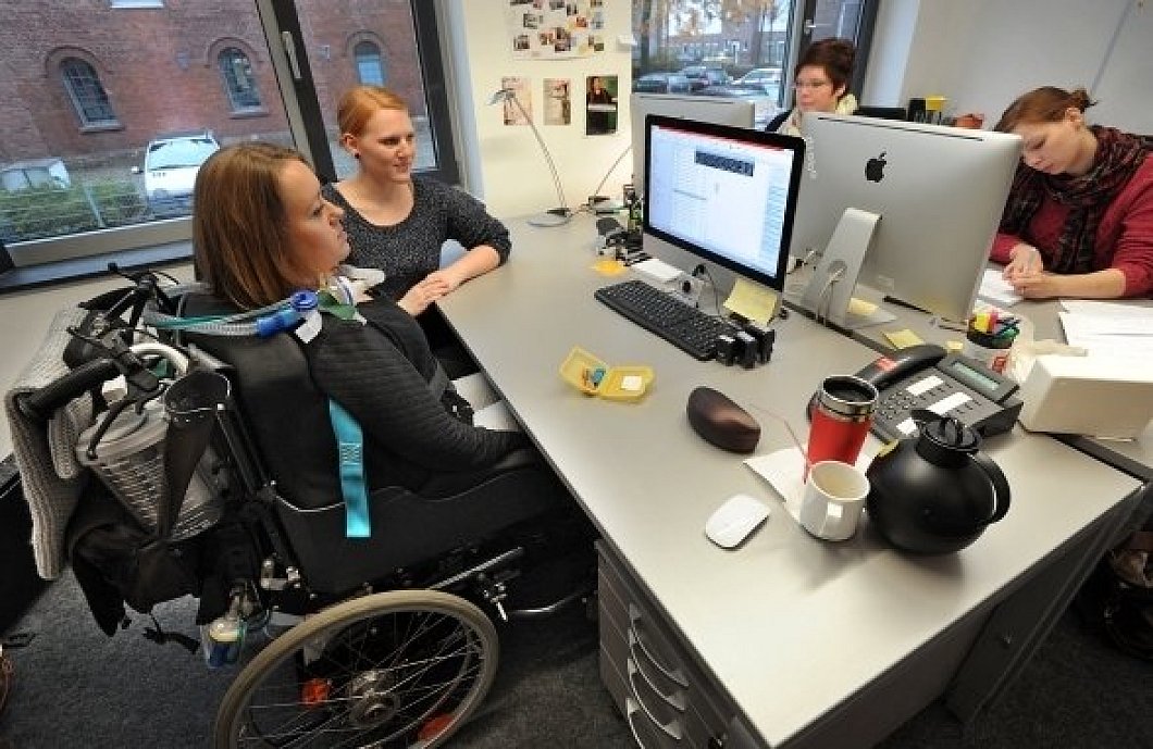 Im Alter von sieben Jahren wurde Kristina Tjagunow bei einem Verkehrsunfall schwer verletzt. Seitdem ist sie vom Hals abwärts querschnittsgelähmt und muss künstlich beatmet werden. Die junge Frau hat sich von dem harten Schicksal aber nicht den Lebensmut nehmen lassen – im Gegenteil. "Man sieht Kristina eigentlich immer lächeln, sie hat immer gute Laune", sagt Mathias Nürmberger, Betriebsratsvorsitzender der Medienfabrik. Im vergangenen Frühjahr hatte sich Tjagunow für ein Praktikum in der Medienfabrik beworben.