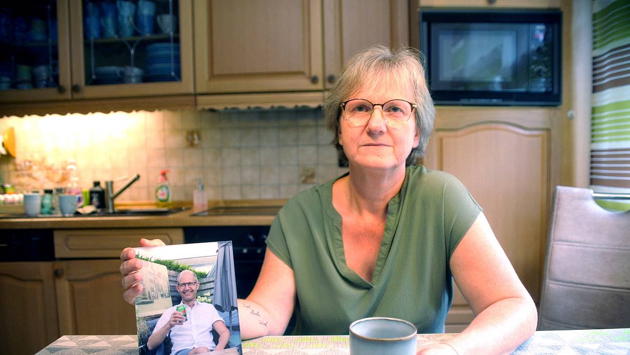 Kerstin Hollmann mit einem Bild ihres verstorbenen Mannes Ralf in der
