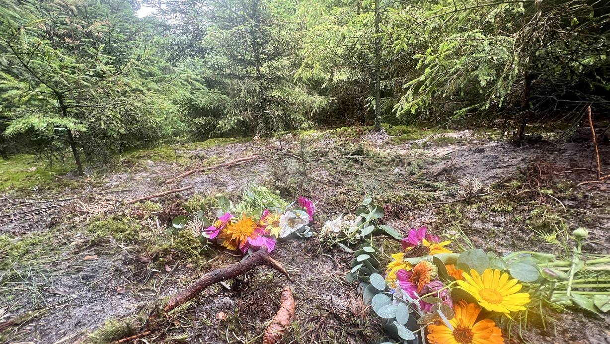 Am Leichenfundort von Marion S. mitten in einer Tannenschonung eines kleines Waldstückes wurden Blumen abgelegt. | © Wolfgang Wotke