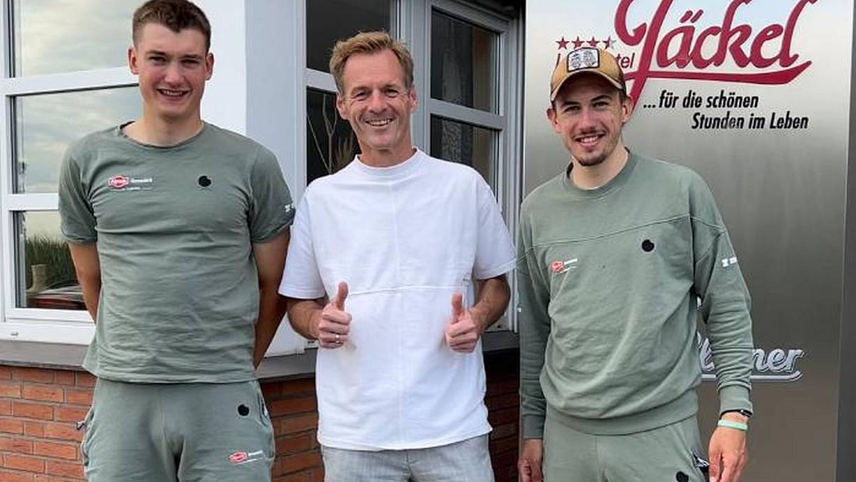Hotel-Chef Andy Marten begrüßte die deutschen Fahrer Timo Behrens (l.) und Henri Uhlig im Landhotel Jäckel. | © Tobias Barrelmeyer