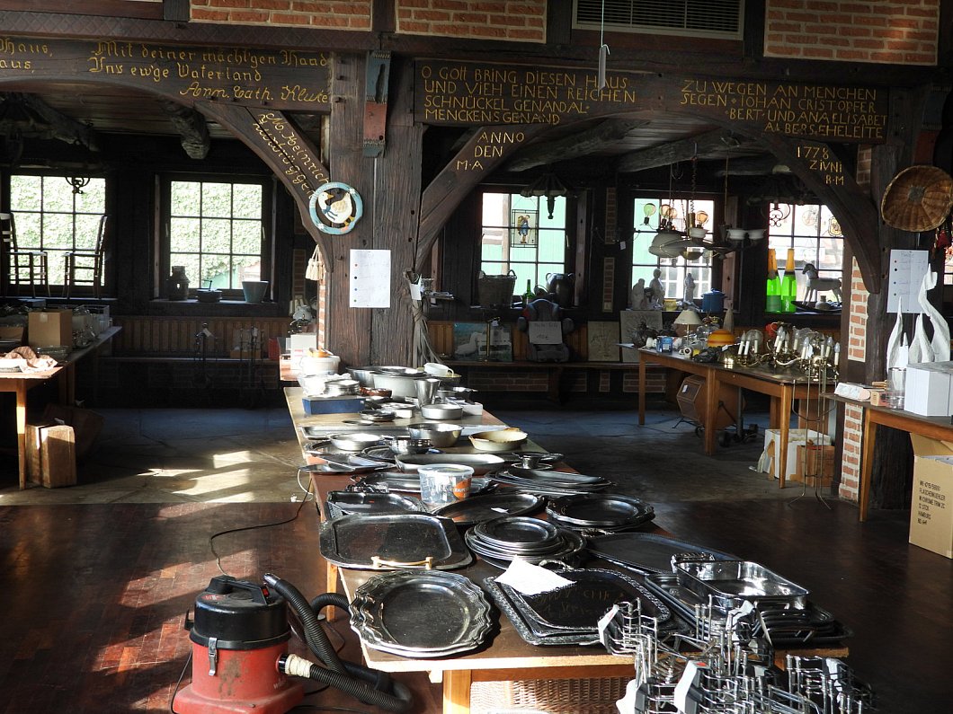 Neben den Möbeln türmen sich unzählige Tischdecken, Gläser in allen Formen und Größen, Geschirr, Stühle, Körbe, Teppiche, Lampen, Handwerksbedarf, Werkzeug, massive Kronleuchter, Steinkrüge, Bettzeug, Spiele, Schallplatten, Dekorationen, Töpfe und große Kaffeekannen auf den Tischen. Der Gaststätten- und Wohnhausinventar-Verkauf ist nicht nur etwas für Sammler und Kenner, sondern auch für Schnäppchenjäger, die sich von Tisch zu Tisch treiben lassen möchten.