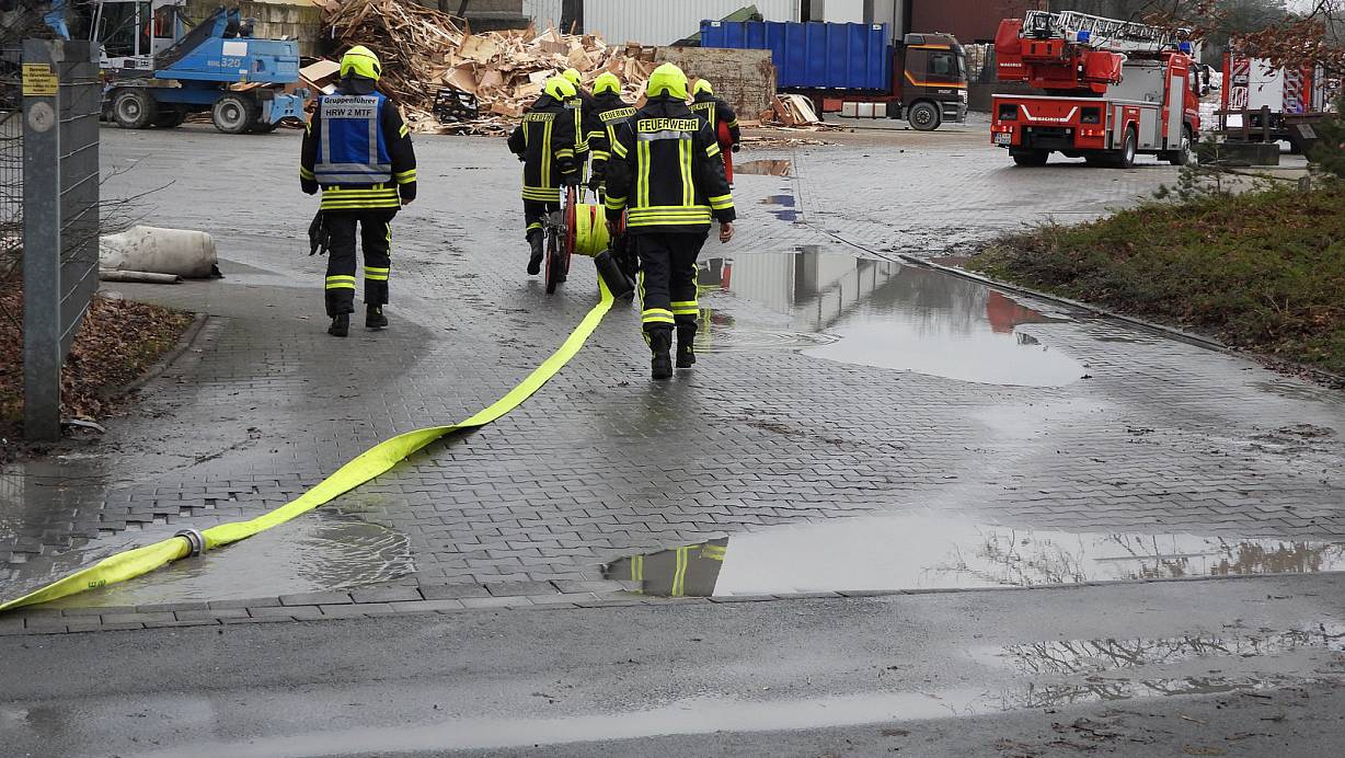 Weil zeitweise eine starke Rauchentwicklung in der Halle herrschte, rüsteten sich Feuerwehrleute mit Atemschutz aus. Mit dem bevorrateten Wasser aus den Tanklöschfahrzeugen wurden erste Löschmaßnahmen durchgeführt. Zeitgleich legten weitere Trupps Schlauchleitungen zum nächstgelegenen Hydranten, um für die Löschtrupps eine stabile Wasserversorgung zu gewährleisten. Nachdem der Brand auf dem Förderband abgelöscht war, wurden die Müllberge auseinandergezogen, um eventuelle Glutnester besser ablöschen zu können.