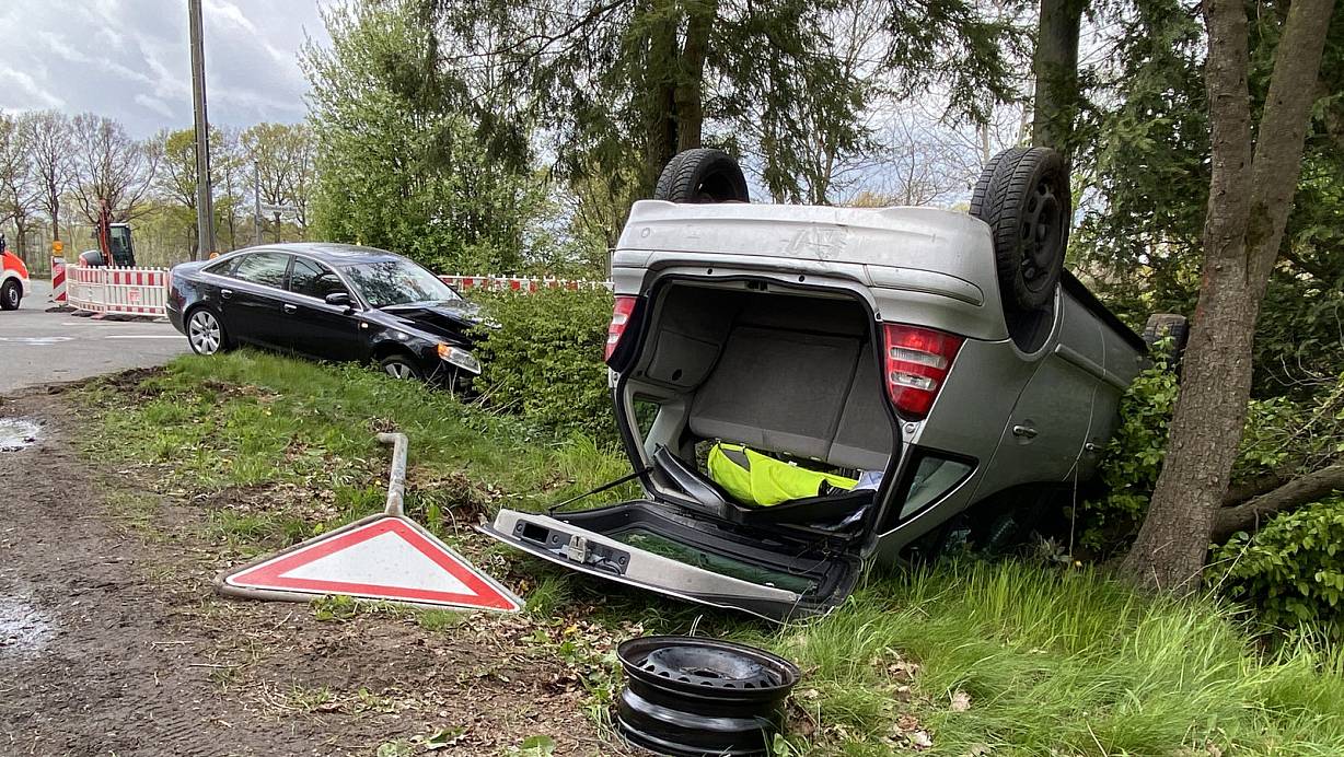 Der Harsewinkeler fuhr auf dem Tecklenburger Weg in Fahrtrichtung Versmold. In der Kreuzungsmitte kam es zum folgenschweren Zusammenstoß. Dabei schleuderten beide Fahrzeuge nach links in einen Graben. Durch die Wucht des Aufpralls überschlug sich der Mercedes und riss ein Verkehrszeichen aus der Verankerung. Das Fahrzeug kam auf dem Dach liegend zum Stillstand.