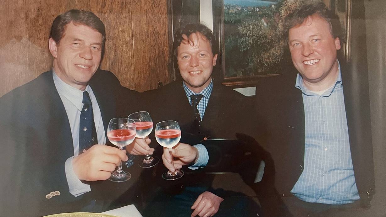 Kaiserslauterns Meistertrainer Otto Rehhagel, der frühere Fußballmanager Volker Graul und Hotelchef Reinhold Frie (von links) stoßen Anfang 2002 auf den Bau der Sportplätze an. | © Wolfgang Wotke