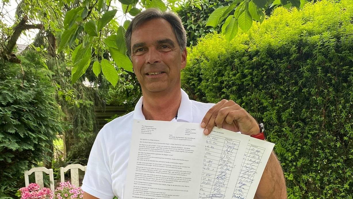 Frank-Ulrich Friedlein zeigt den Brief und die Unterschriftenliste, die er an Bürgermeisterin Sabine Amsbeck-Dopheide, Landrat Sven-Georg Adenauer und die Kreispolizeibehörde Gütersloh geschickt hat. Der 61-Jährige macht sich Sorgen. Fotos: Markus Voss | © Markus Voss