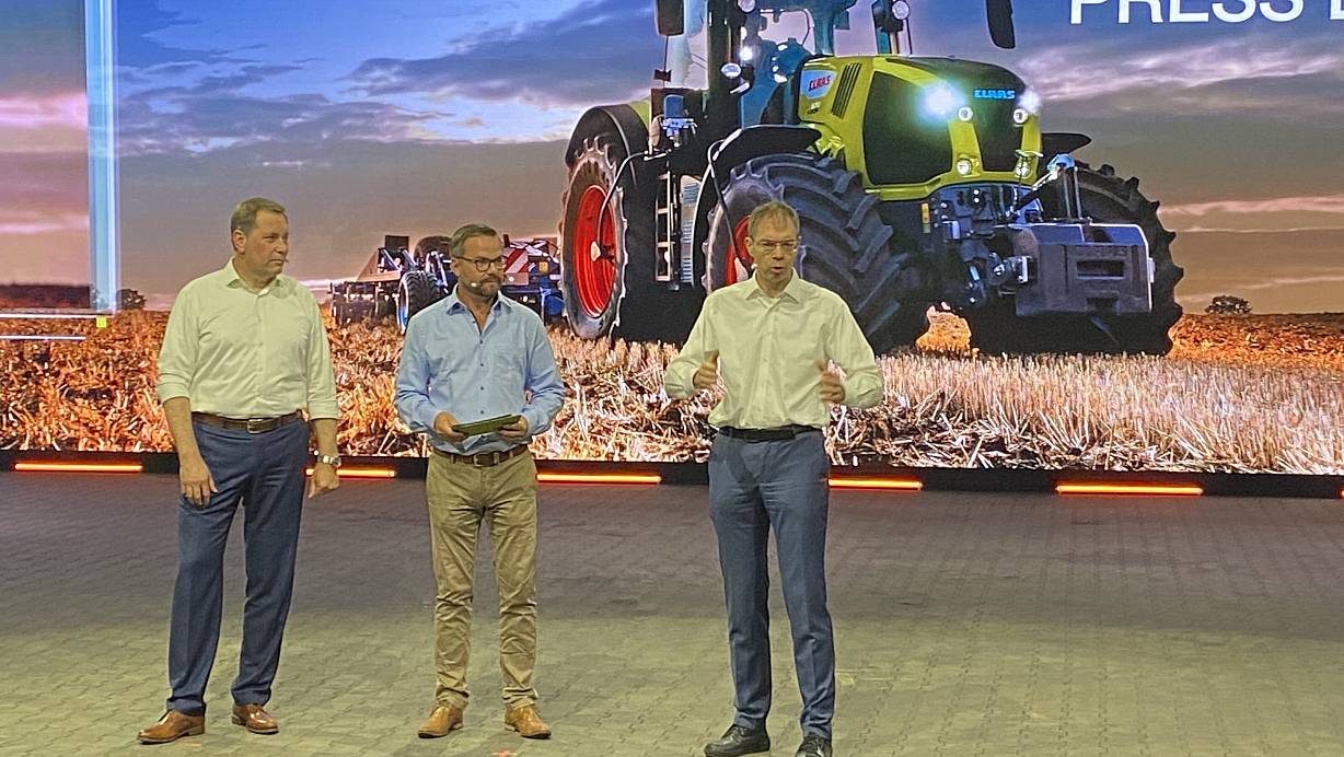 Claas-Chef Jan-Hendrik Mohr (links) bei der Präsentation der neuen Fahrzeugflotte von Claas im Juli im Kreis Gütersloh. | © Burkhard Hoeltzenbein
