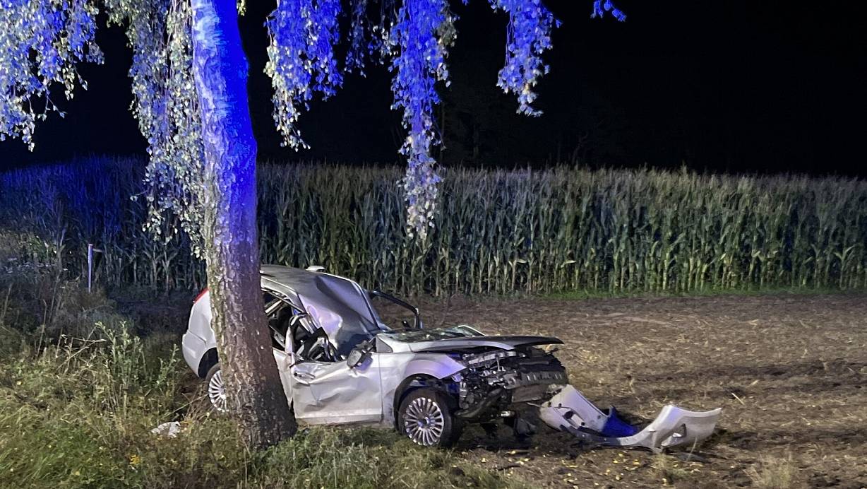 Aus bislang ungeklärter Ursache kam der 20-Jährige mit einem Ford Focus von der Brockhäger Straße in Marienfeld im Kreis Gütersloh ab. Das Fahrzeug drehte sich auf die Seite und prallte mit dem Dach gegen einen Baum. | © Thorsten Heß