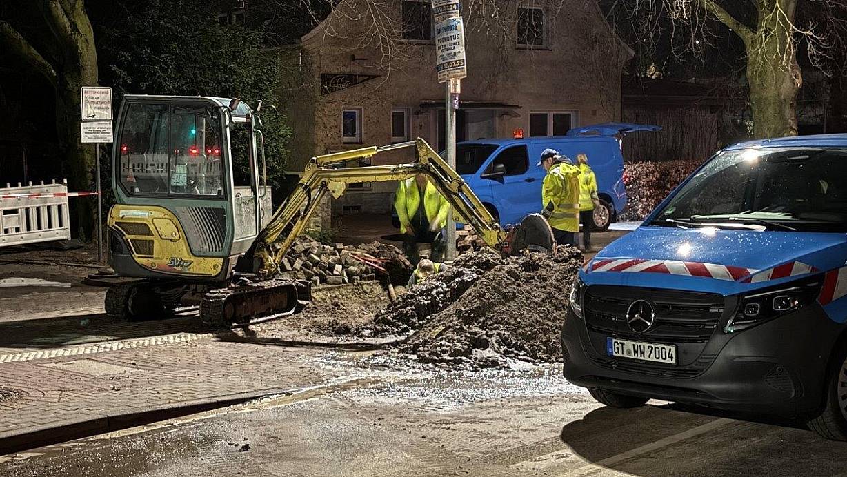 Mitarbeiter des Wasserwerks schließen mit Hilfe einer Baufirma die Rohrbruchstelle am Tecklenburger Weg im Kreis Gütersloh. | © Gabriele Grund