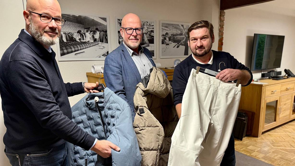 Thomas Becker (v. l.) und Thomas Kiffmeyer vom Modehaus Bessmann in Harsewinkel beklagen ebenso wie Robert Lehnort (r., Sport Weckenbrock) Verluste durch Edding-Markierungen auf hochwertigen Kleidungsstücken. | © Robert Becker