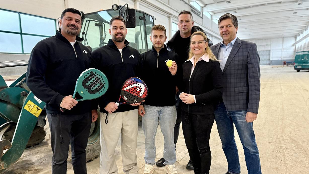 Bobby Birol (v.l.), Christopher Laugwitz und Simon Nolte betreiben gemeinsam mit Christian Miele künftig den Motions Rackets Club Marienfeld. Annette und Hermann Kuhre vermieten dafür die Halle ihres früheren Betonfertigteilwerks. | © Robert Becker