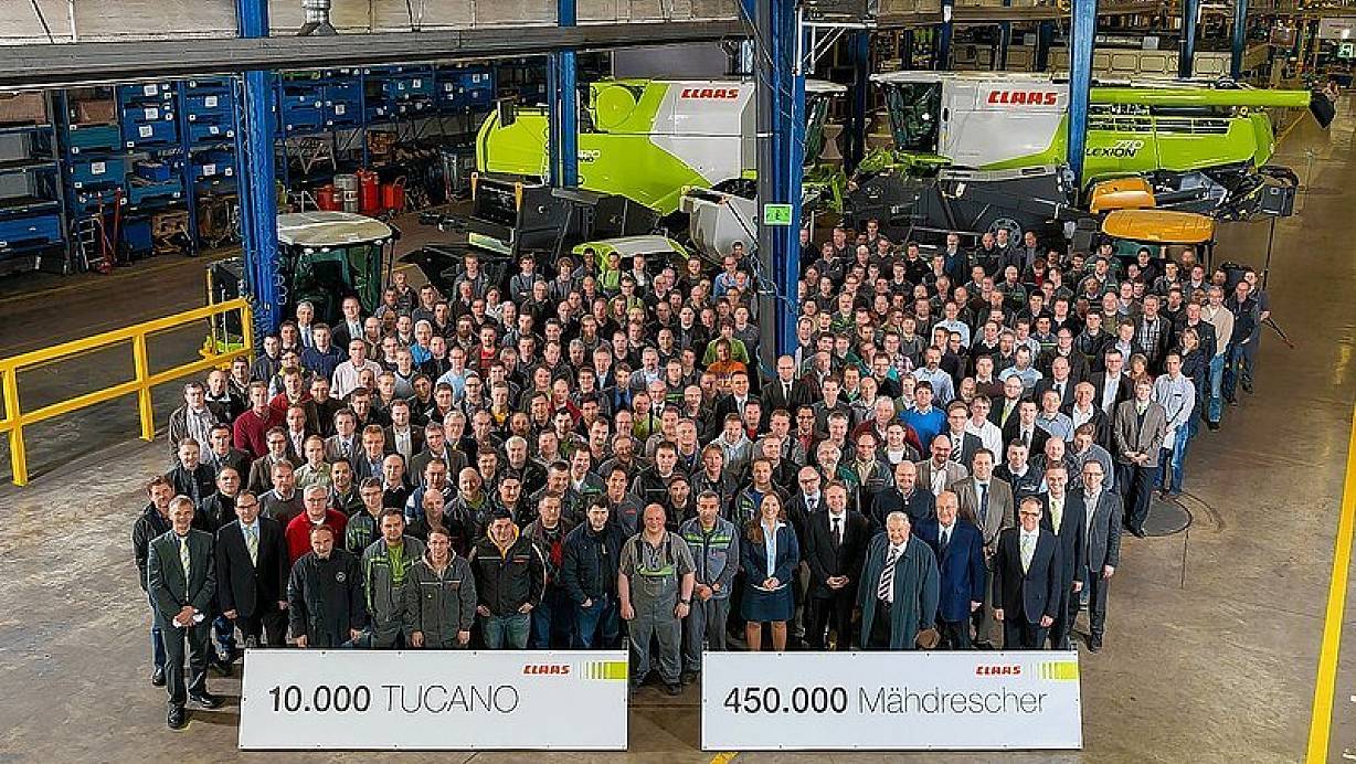 Harsewinkel (NW). Noch zwei Jubiläen des 2013 seit 100 Jahren bestehenden Unternehmens Claas: Die Produktion in Harsewinkel feierte den 450.000. Mähdrescher, der eine Maschine vom Typ Lexion für den nordamerikanischen Markt ist. Gesellschafter, Geschäftsführung und 350 Mitarbeiter kamen anlässlich dieser Feierstunde in der Produktion am Standort Harsewinkel zusammen. Einen weiteren Anlass zum Feiern bietet der 10.000. Tucano, der ebenfalls in den letzten Wochen produziert wurde und an einen osteuropäischen Kunden geht.