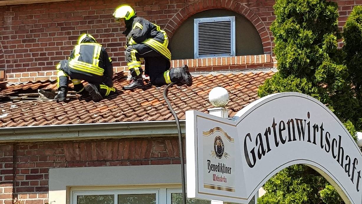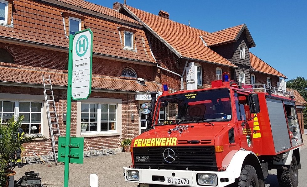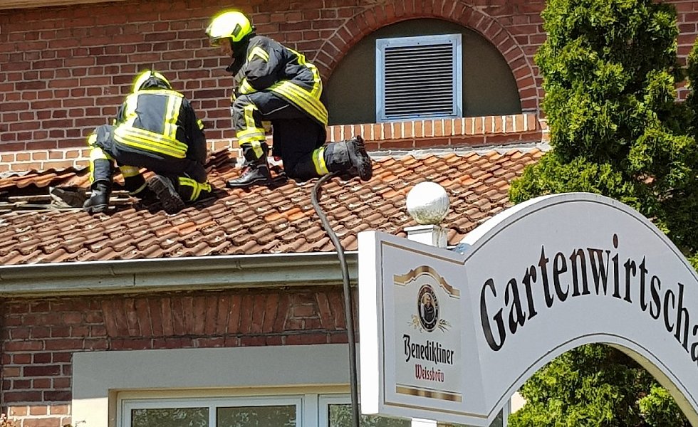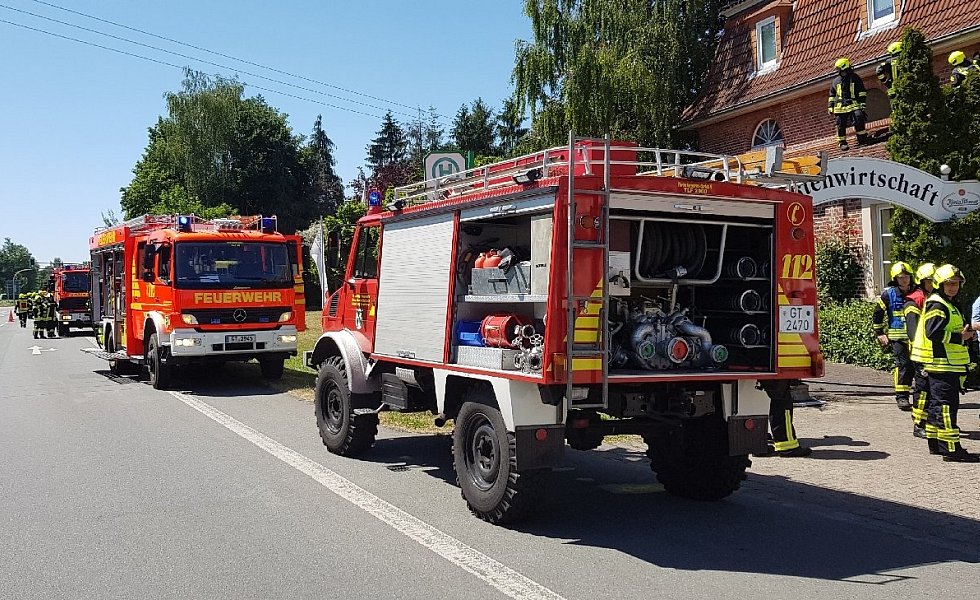 So konnte auch die Drehleiter aus Harsewinkel gleich nach ihrem Eintreffen wieder abrücken, der Schaden blieb auf das Vordach und die unmittelbare Nähe der Lüftungsanlage beschränkt. So kann die Gaststätte auch weiterhin uneingeschränkt genutzt werden, auch für den Abiball besteht keine Gefahr.
