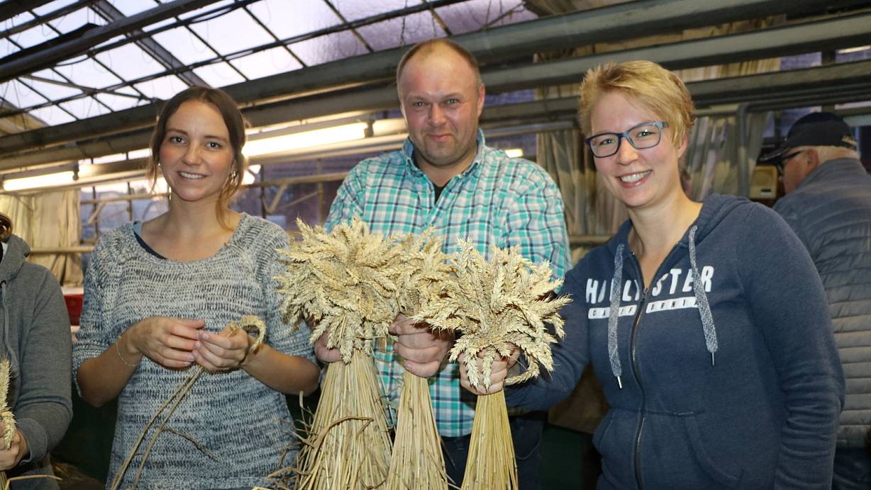 Gemeinschaftsaktion: Lena Horstkötter, Andreas Rohe und Maria Tegelkamp (v.l.) binden aus Weizen-Ähren Bunde, die dann die Laternen in Clarholz schmücken sollen. | © Anja Hustert