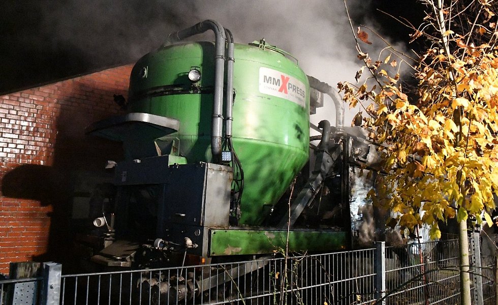 Ihr Augenmerk legten die Einsatzkräfte auf den mehrere hundert Liter Diesel fassenden Tank des Lkw, mit dem auch der Motor der Mahl- und Mischanlage betrieben wird. Vorsichtshalber wurde der Abfluss auf dem Hof abgedichtet, damit möglicherweise kontaminiertes Löschwasser nicht in die Natur gelangte. Durch den schnellen Löscherfolg blieb der Tank dicht, eine Mitarbeiterin der Unteren Wasserbehörde des Kreises Gütersloh wurde an die Einsatzstelle gerufen.