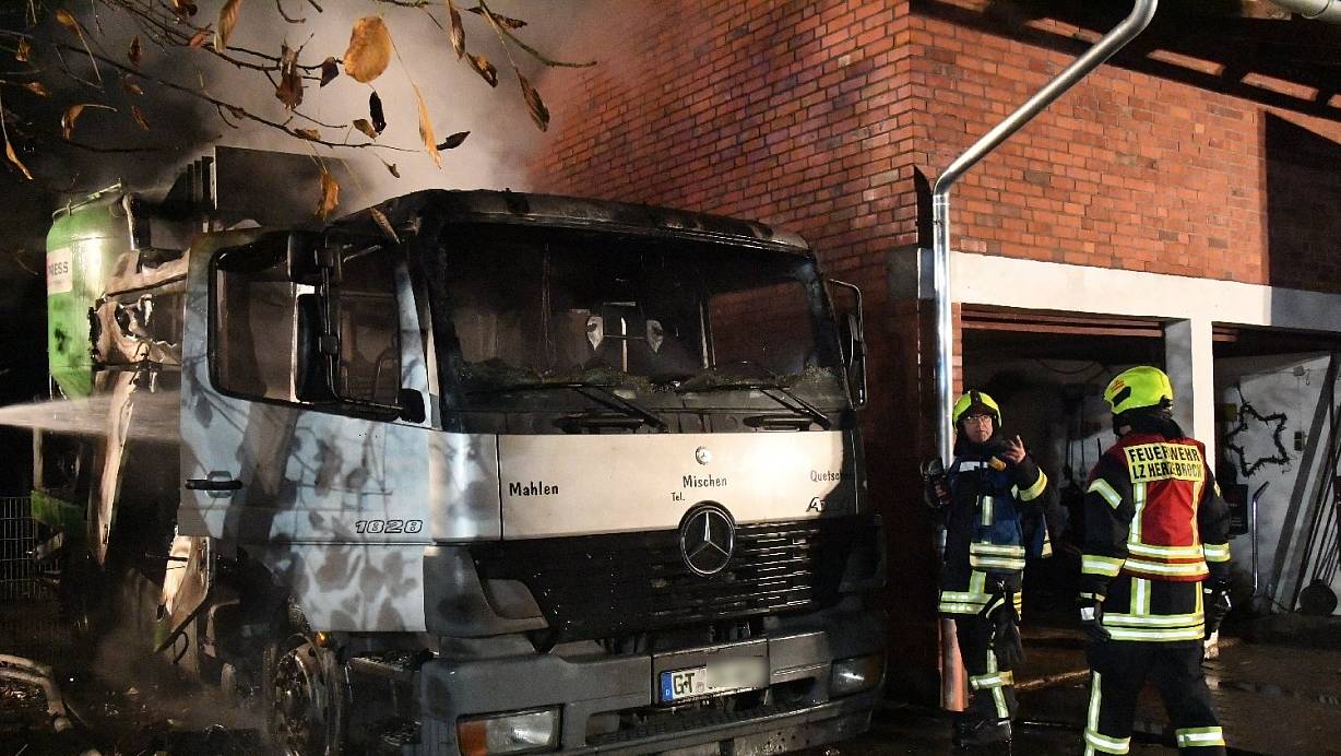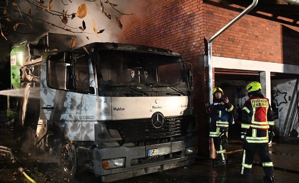 Um 0.53 Uhr waren die Bewohner eines landwirtschaftlichen Anwesens an der Menninghauser Straße im Ortsteil Möhler durch einen lauten Knall aus dem Schlaf gerissen worden. Ein auf dem Hof abgestellter LKW, eine fahrbare Mahl- und Mischanlage, war aus bisher ungeklärter Ursache in Brand geraten. "Als wir hier eintrafen, schlugen die Flammen meterhoch in den Himmel, neben den alarmierten Löschzügen Möhler und Herzebrock wurde auch der Löschzug Clarholz alarmiert", berichtete der Einsatzleiter.