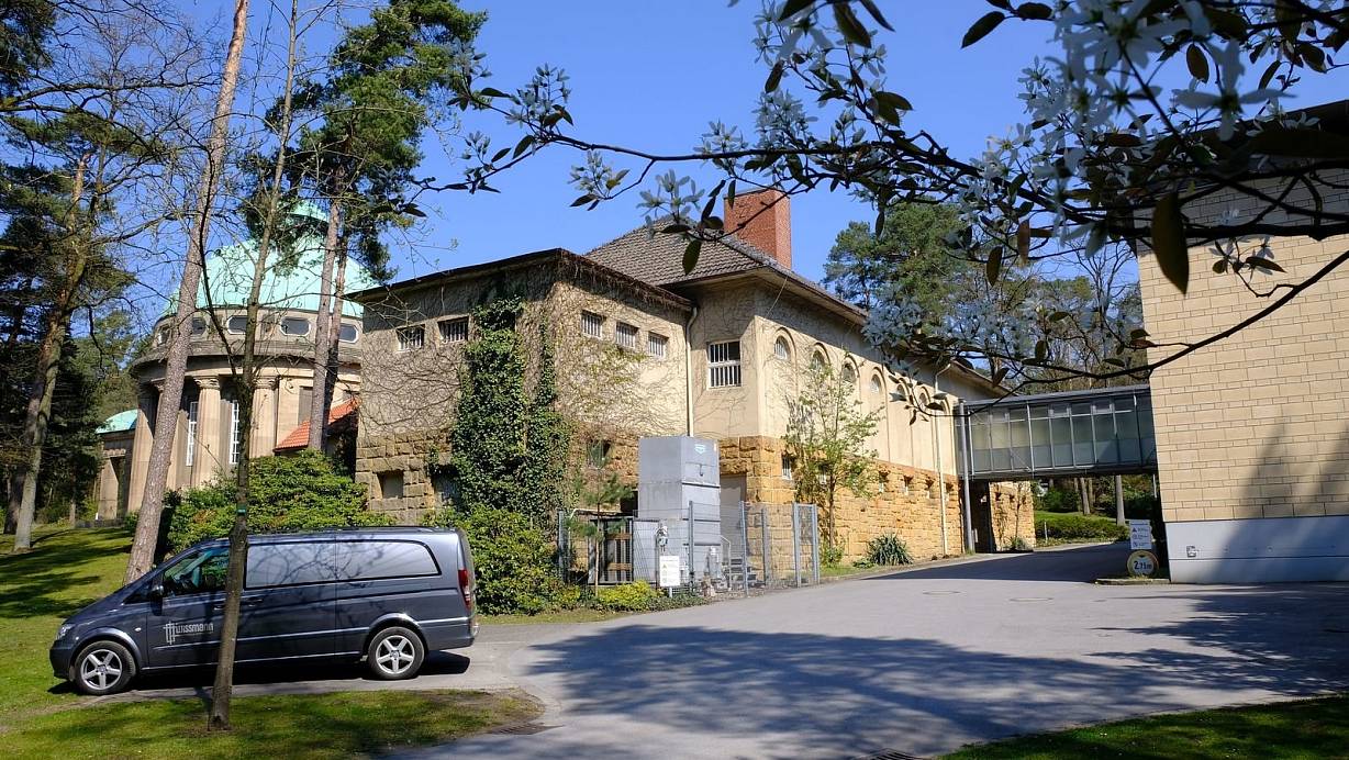 So sieht das Bielefelder Krematorium am Sennefriefhof aus, in dem auch Verstorbene aus dem Kreis Gütersloh verbrannt werden. Die Alte Kapelle, die Arkaden und das Krematoriumsgebäude von 1929 stehen unter Denkmalschutz. Ein gläserner Übergang führt hinüber in den Neubau. | © Susanne Lahr