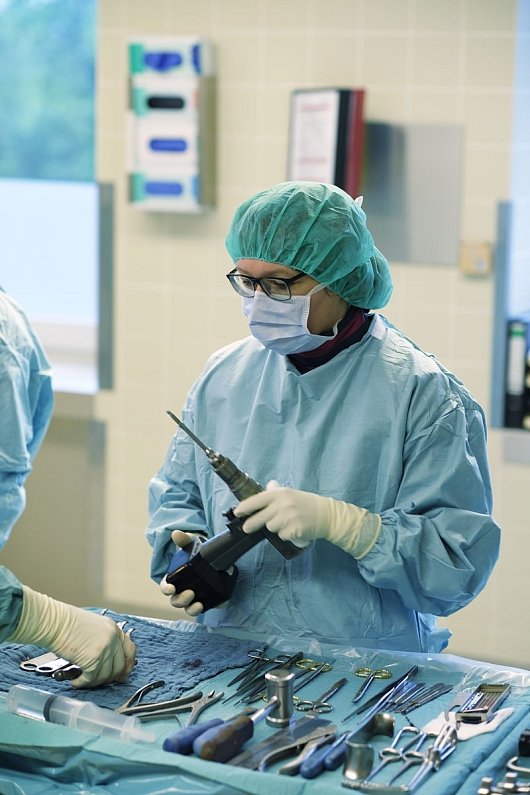 Während der erste Patient um 7.30 Uhr im Vorbereitungsraum darauf wartet, dass es los geht, laufen im Hintergrund zahlreiche Prozesse zusammen. In der Zentralsterilisation werden die Siebe mit den Instrumenten gepackt, die OP-Schwestern bereiten den Saal vor und sorgen dafür, dass alles steril und an seinem Platz ist, was die Chirurgen für den Eingriff benötigen werden – eine Art Werkzeugkoffer, der vom Skalpell über Zangen, Klammern, Hammer und Meißel bis hin zu verschiedenen Sägen und einer Bohrmaschine an das Equipment eines Hobbykellers erinnert.