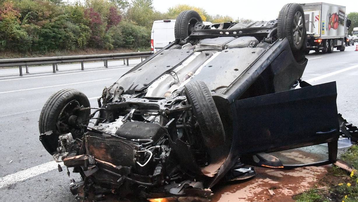 Der blaue Seat mit Düsseldorfer Kennzeichen schleuderte nach rechts von der Fahrbahn, überschlug sich und blieb schließlich rund 100 Meter weiter auf dem Seitenstreifen der Autobahn auf dem Dach völlig beschädigt liegen.