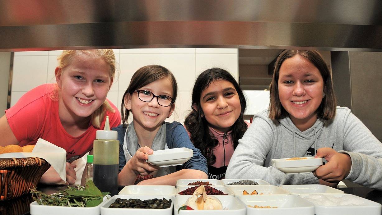 Lara, Svea, Evangelia und Giulia stehen hinter einem Tablett mit außergewöhnlichen Gewürzen und Streuzutaten, mit denen die Speisen dekoriert werden. | © Waltraud Leskovsek