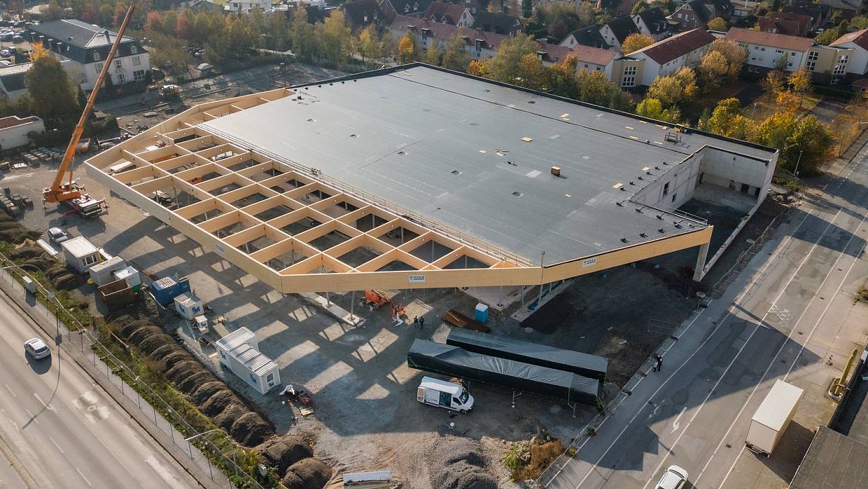 nathlos ineinander greifen konnten. Noch in bester Erinnerung war Kramer ein Gespräch mit seinem Architekten Joachim Oehme (Bielefeld), der ihn früh gefragt habe, ob er denn ein Blechdach oder eines aus Holz wünsche. „Natürlich aus Holz", habe er spontan gesagt, „ohne zu ahnen, was ich damit auslöse". Inzwischen ist das 7.000 Quadratmeter große Dach fertig, und der Betrachter staunt über eine massive Konstruktion aus 250 Tonnen