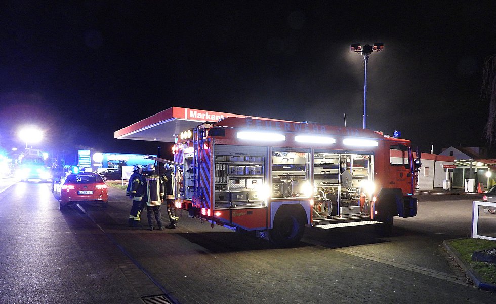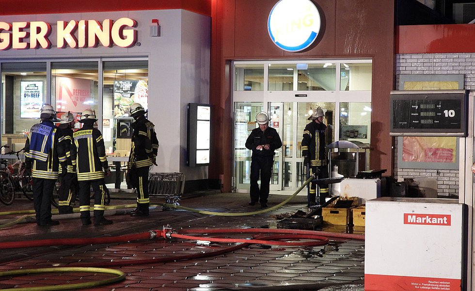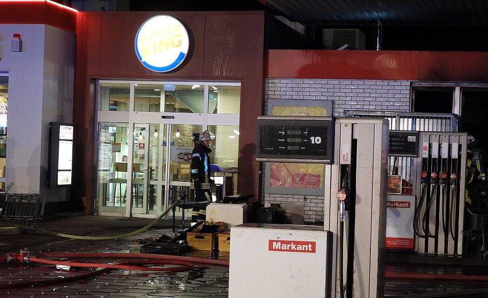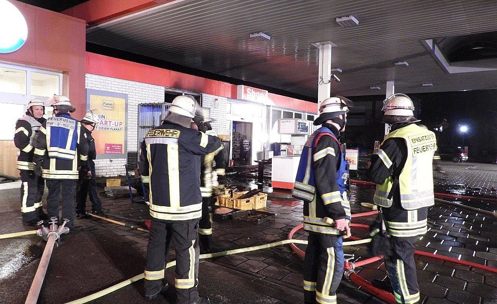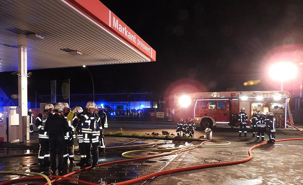 Aufgrund der Erstmeldung "Brand in einem Industriegebäude" waren rund 100 Einsatzkräfte der Löschzüge Wiedenbrück und Rheda ausgerückt. Bei Eintreffen der Wiedenbrücker Feuerwehrleute, die aufgrund eines nur kurzen Anfahrweges schnell an der Einsatzörtlichkeit waren, schlugen bereits Flammen aus dem Fenster eines Nebenraumes des Tankstellengebäudes. Brenzlig war, dass in unmittelbarer Nähe eine Gitterbox mit Gasflaschen stand. Die Kunden des Schnellimbiss hatten das Restaurant vorsorglich bereits verlassen.