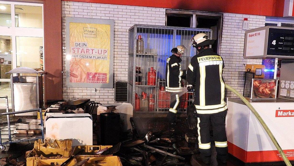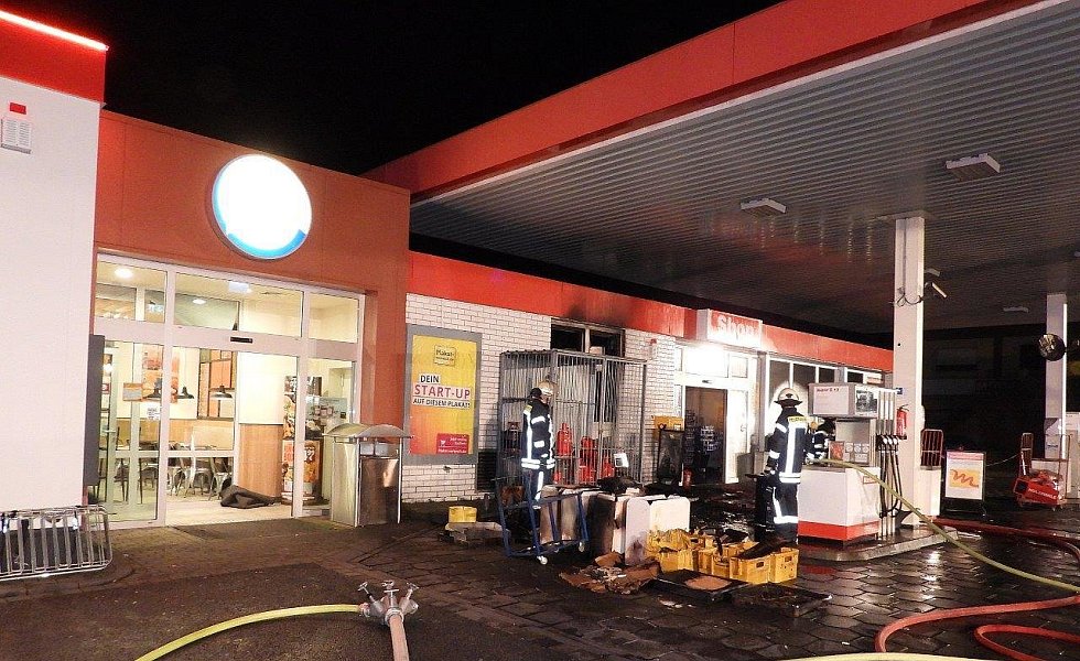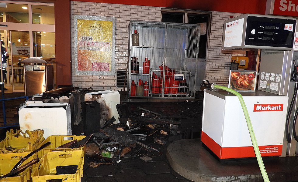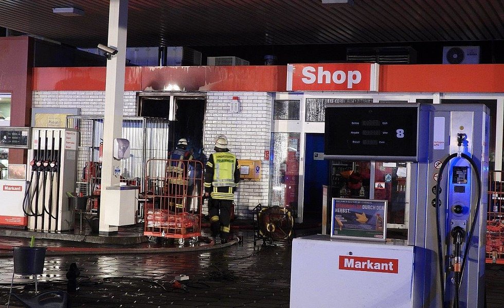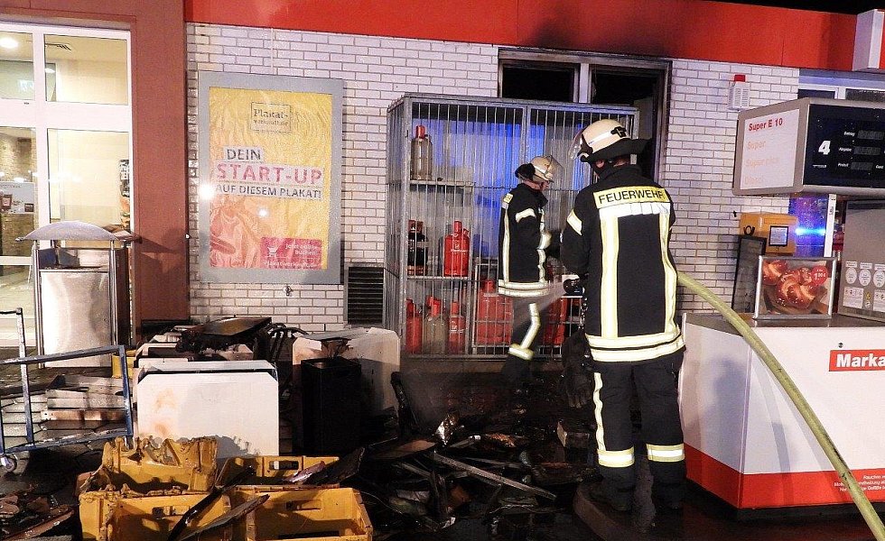 Rheda-Wiedenbrück. Aus bislang ungeklärter Ursache kam es am Sonntagabend, gegen 20.18 Uhr, zu einem Brand in einem Lager- und EDV-Raum auf dem Gelände der Markant-Tankstelle in Wiedenbrück. Kunden eines angrenzenden Schnellimbisses hatten den 18-jährigen Tankstellenmitarbeiter auf das Feuer aufmerksam gemacht. Beherzt versuchte dieser den Brand mittels Feuerlöscher unter Kontrolle zu bekommen, zeitgleich ging ein Notruf an die Feuerwehr raus.