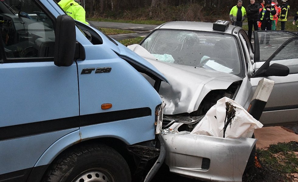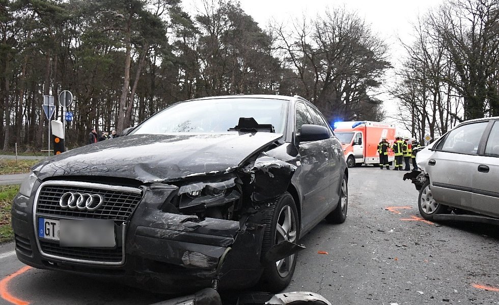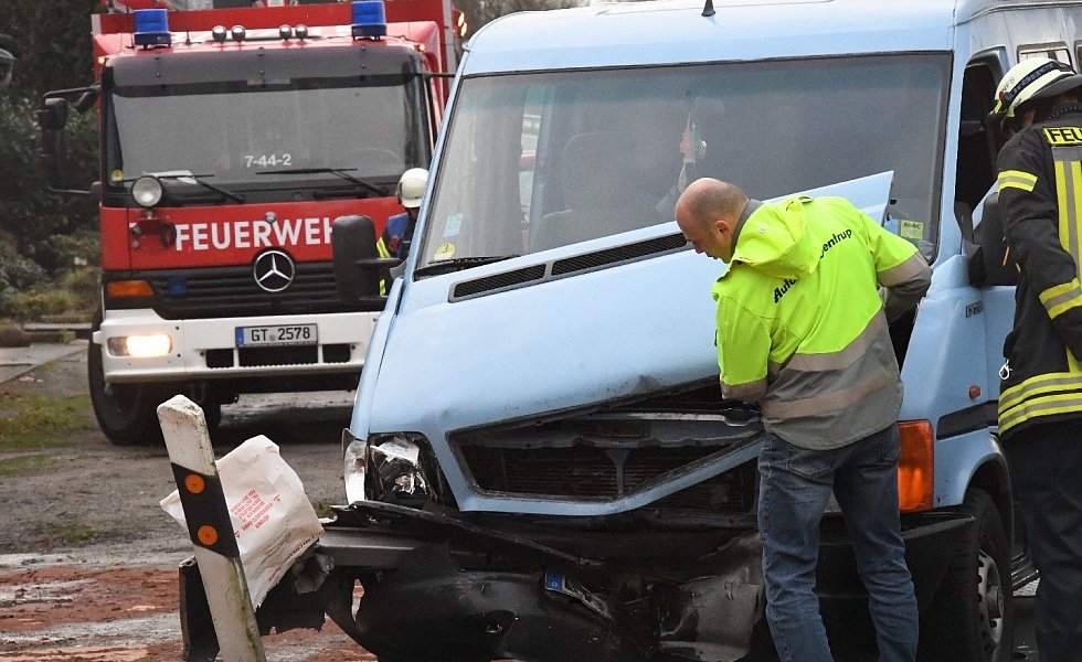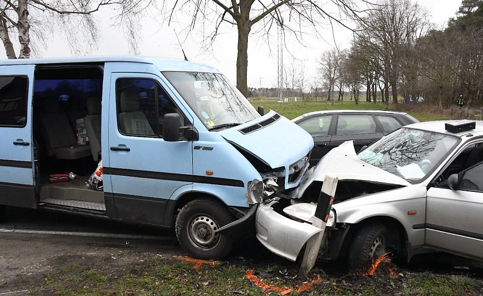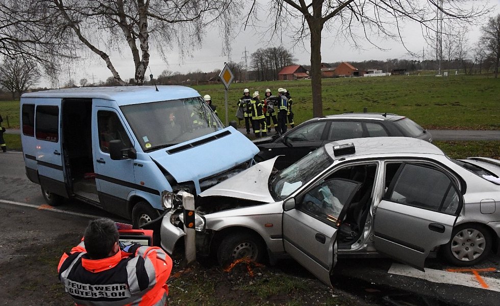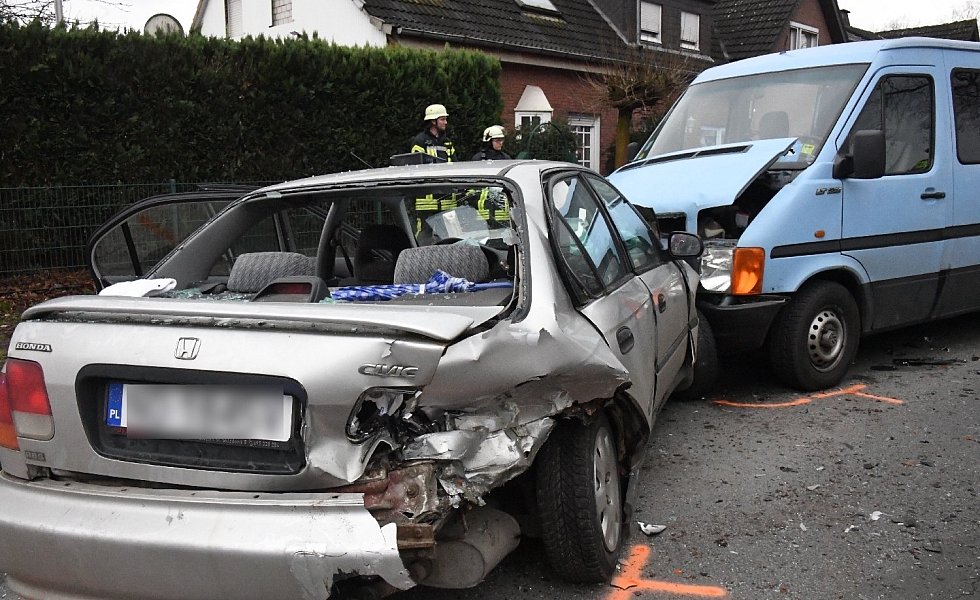 Der 52-jährige Verler war auf der Varenseller Straße in Richtung Wiedenbrück unterwegs, als aus der Straße „Zum Sägewerk" plötzlich vor ihm der Honda Civic einbog. Der Fahrer des Audi A3 konnte nicht mehr rechtzeitig bremsen und fuhr hinten rechts auf. Durch die Wucht des Aufpralls, so die Polizeibeamten an der Unfallstelle, wurde der Civic auf die Gegenfahrbahn geschoben. Hier war ein VW LT-Kleinbus unterwegs, neben dem Fahrer waren noch fünf Mitfahrer an Bord. Es kam zum Frontalzusammenstoß der beiden Fahrzeuge.
