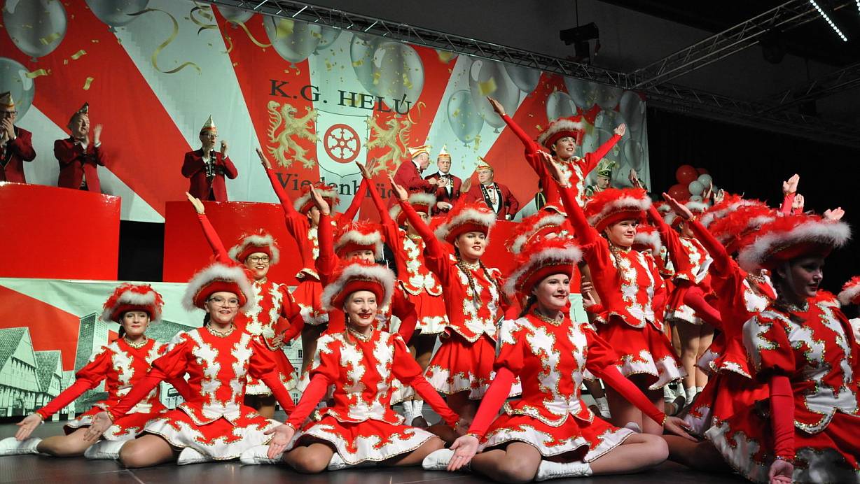 Beim musikalischen Intermezzo mit eigenen kölschen Liedern gefällt die Band „Palaver". Danach setzen sich die jüngsten der insgesamt 150 Helü-Tänzerinnen und -tänzer bei flotter Marschmusik in Szene. Sonderapplaus gibt es für das elfjährige Solo-Mariechen Alina Lagache. Deren Paartanzpartnerin war krankheitsbedingt ausgefallen und so wirbelt sie allein über die Bühne.
