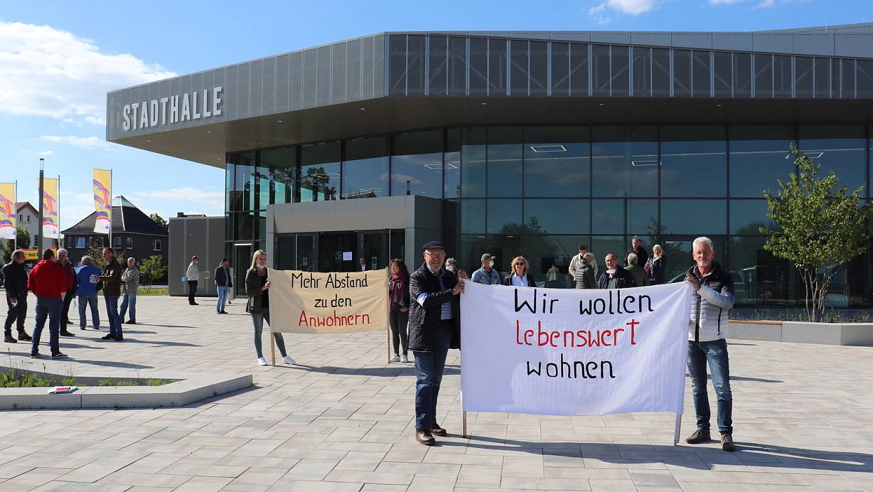 Vor der Stadthalle zeigen die Mitglieder des Vereins "Mit Natur wohnen", was sie von Politik und Verwaltung wünschen. Das vordere Transparent halten Günter Arlt (l.) und Burkhard Ellefred. | © Marion Pokorra-Brockschmidt