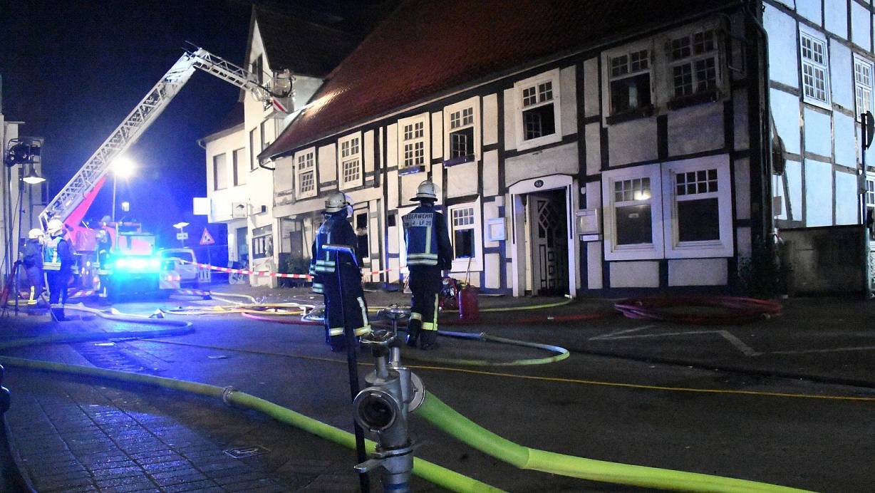 In der Nacht zu Montag steht plötzlich ein unter Denkmal stehendes altes Fachwerkhaus in Rheda-Wiedenbrück in Flammen. Die Feuerwehr muss nach möglichen Personen vor Ort suchen - die Ursache ist noch unklar.