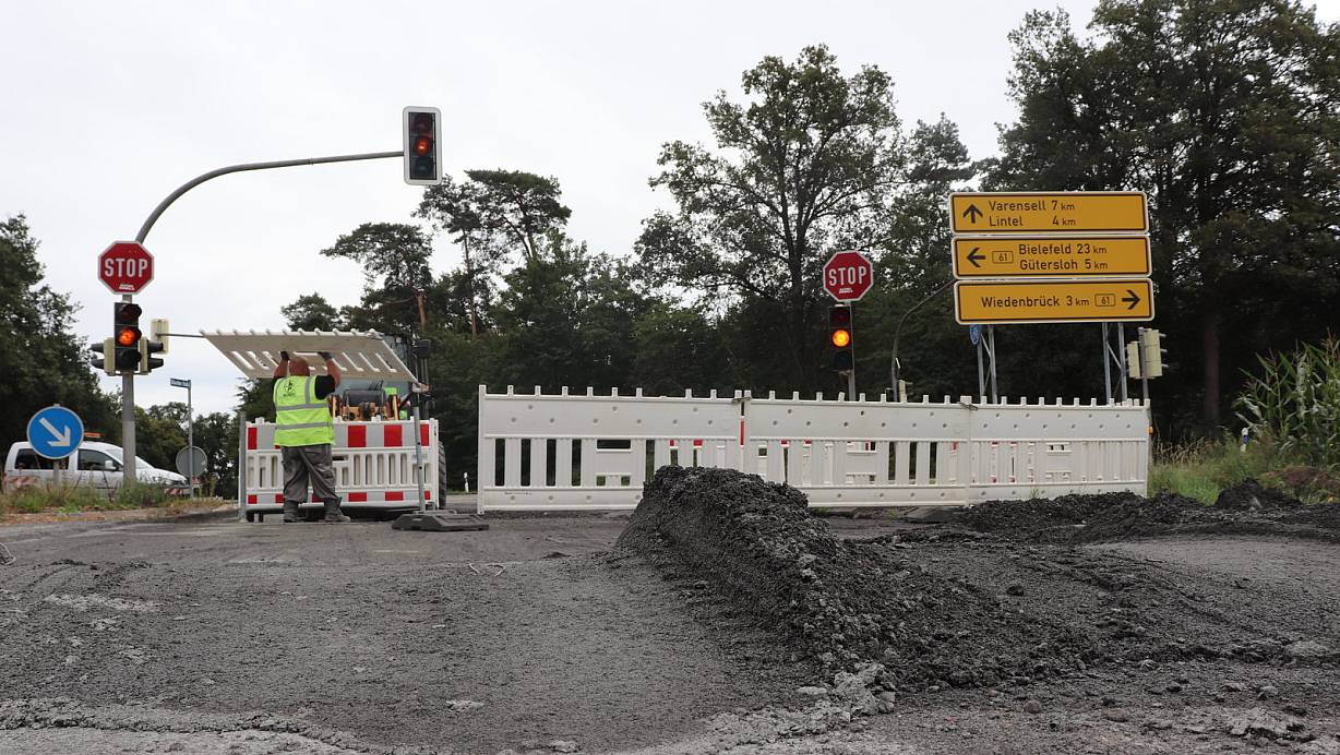Saniert wird die Kreuzung B61/L586. Darum ist sie bis voraussichtlich 10. September für den Durchgangsverkehr gesperrt. Radfahrer und Fußgänger können die Baustelle passieren. | © Marion Pokorra-Brockschmidt