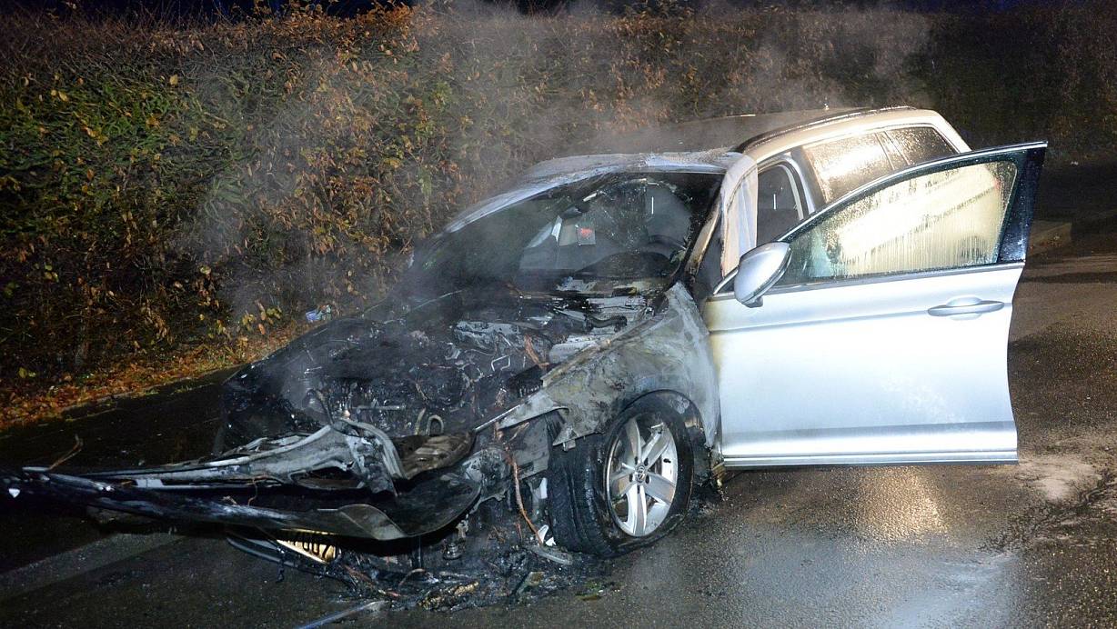 Augenscheinlich war der Brand auf der Fahrerseite entstanden und hatte sich bereits auf den gesamten Motorraum ausgebreitet. Die Flammen schlugen bereits aus dem Motorraum in den nächtlichen Himmel. Auch der Innenraum war betroffen.Zwei Feuerwehrleute hatten sich bereits auf der Anfahrt mit Atemschutzgeräten ausgerüstet und löschten die Flammen schließlich vollständig ab. Einen Totalschaden an dem Fahrzeug konnten sie aber nicht verhindern.Die Umstände der Brandentstehung sind nach Polizeiangaben bislang unbekannt. Das Fahrzeug wurde deshalb von den Beamten für weitere Untersuchungen sichergestellt. Der entstandene Schaden wird auf etwa 15.000 Euro geschätzt.
