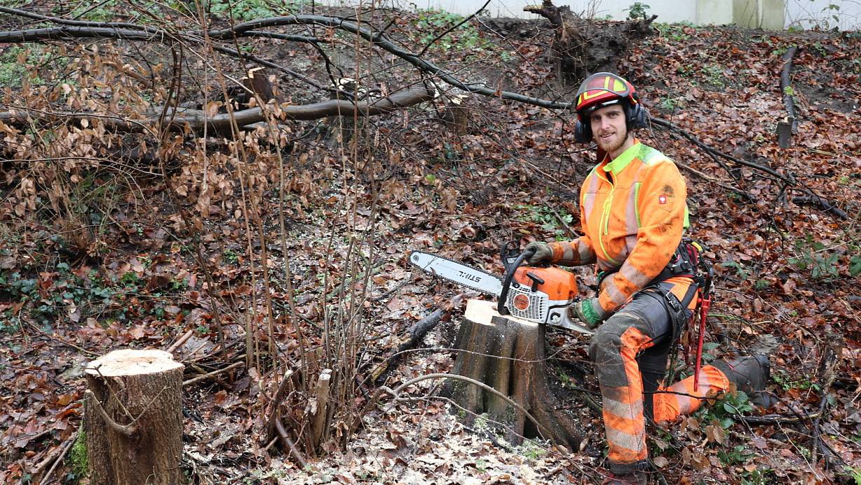 Oliver Richter ist Baumkletterer. Er sägt die Bäume an der Böschung der A2 ab. | © Marion Pokorra-Brockschmidt