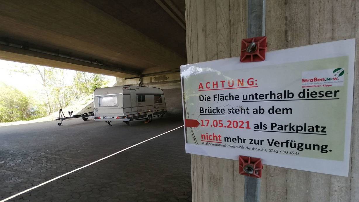 Schilder weisen darauf hin, dass Fahrzeuge ab 17. Mai nicht mehr unter der Brücke an der Straße Am Jägerheim abgestellt werden sollen. | © Marion Pokorra-Brockschmidt
