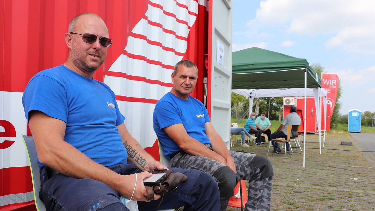 Saulens Samuolis (l.) und Viktor Bologan kommen aus Herford und sind auf dem Weg zu ihrem nächsten Einsatzort von der A2 abgebogen, um sich impfen zu lassen. | © Marion Pokorra-Brockschmidt