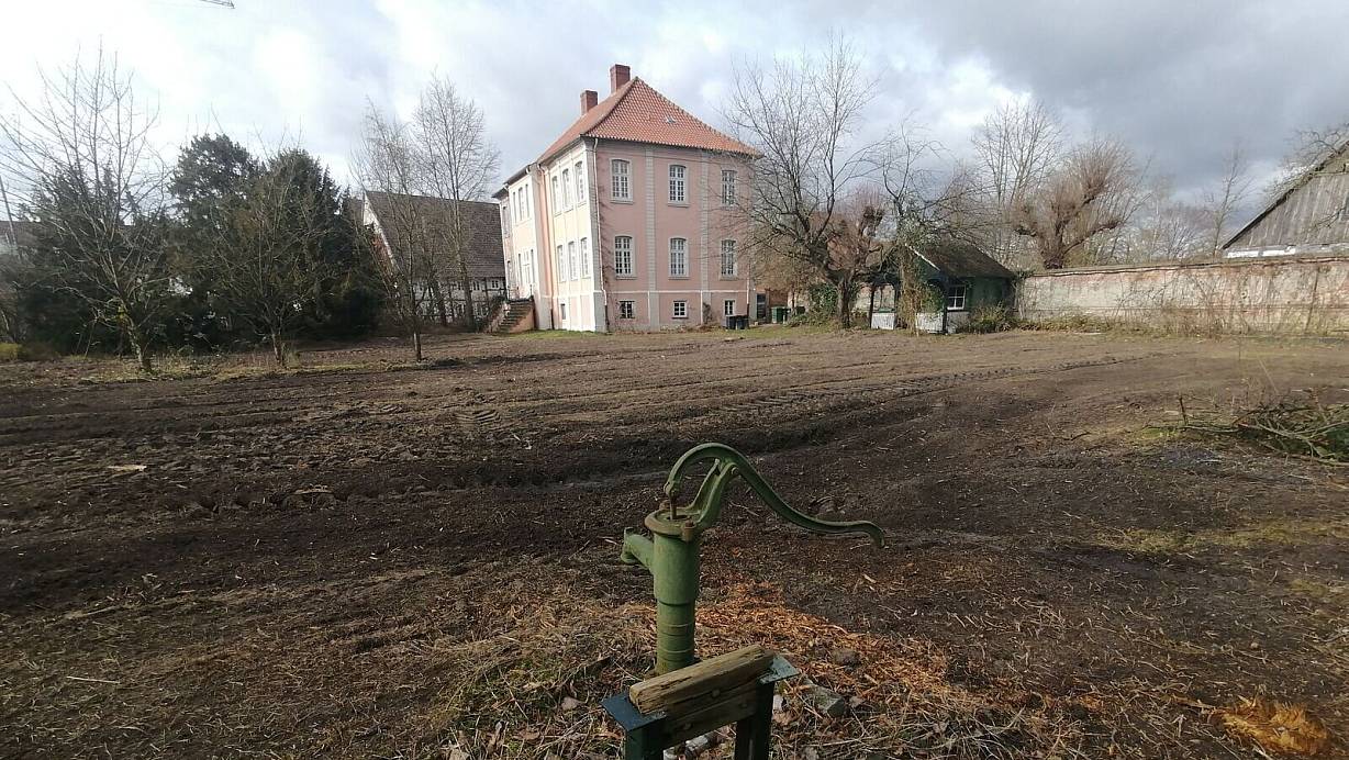 Vom ehemaligen Garten am Heising-Palais in Rheda-Wiedenbrück im Kreis Gütersloh, auch Witwenpalais genannt (hinten), ist außer einer alten Handwasserpumpe und Bäumen nicht mehr viel zu sehen. | © Marion Pokorra-Brockschmidt