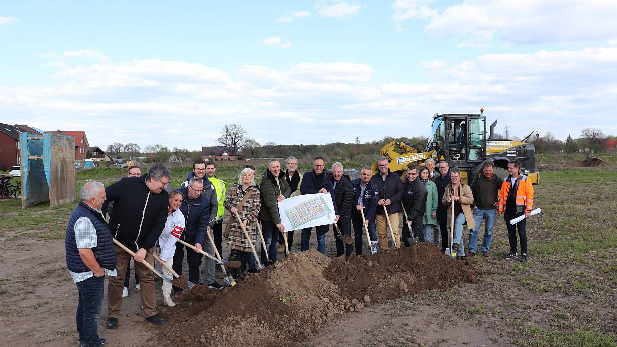Zum symbolischen ersten Spatenstich sind im Baugebiet Varenseller Straße Politiker, Verwaltungsmitarbeitende und mit der Erschließung beauftragte Unternehmen zusammengekommen. Die knapp acht Hektar große Fläche wird jetzt erschlossen und teils bereits vermarktet | © Marion Pokorra-Brockschmidt