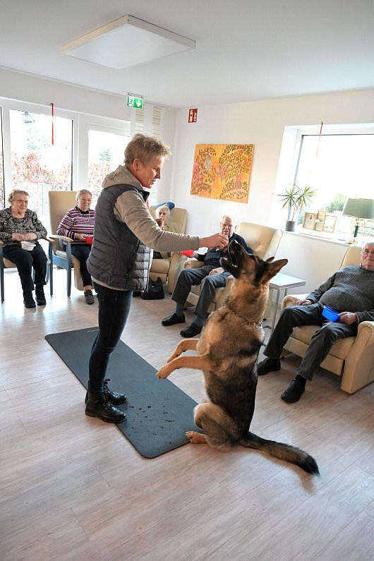 „Alleine schon das Zuschauen, wenn der Hund seine kleinen Kunststücke zeigt oder liebevoll alle begrüßt - das ist wunderschön“, sagt eine Teilnehmerin. Ursula Treutler ist mit Tieren vertraut. Sie hat häufig Umgang mit Hunden in ihrer Familie. Sie ist immer entzückt, wie gut der erst drei Jahre junge Hund schon gehorcht.
